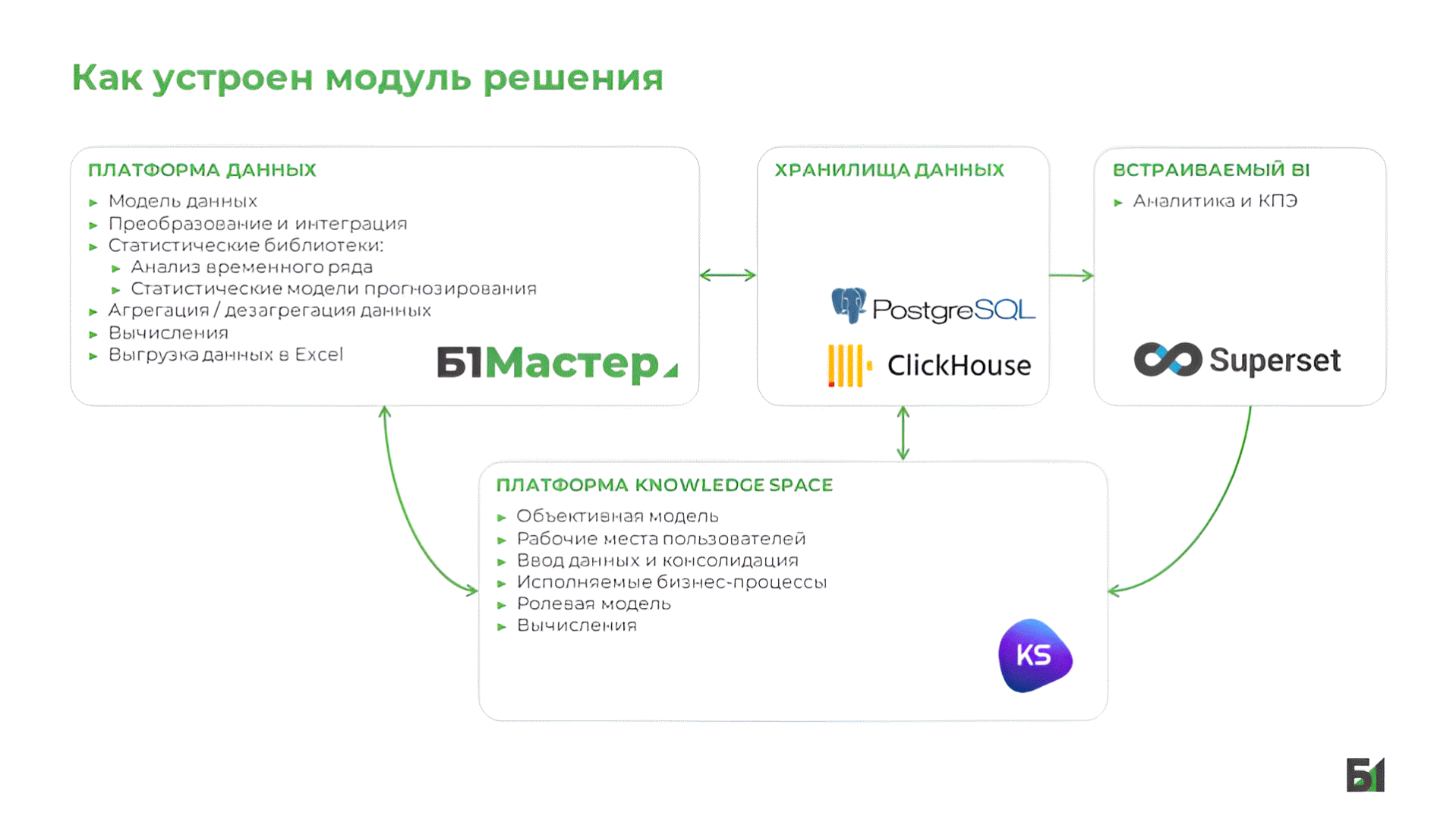 В рамках проекта была разработана комплексная архитектура, где расчетным ядром выступила платформа «Б1 Мастер». На ней была выстроена модель данных, позволяющая выполнять ключевые вычисления: очистка истории, прогнозирование, консолидация прогноза с учетом блоков роста, промо и ручных корректировок.