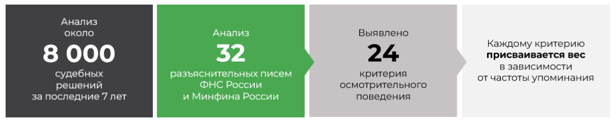 Присвоение веса осуществлялось нами на основе комплексного анализа разъяснительных писем ФНС России и Министерства финансов РФ по вопросу применения ст. 54.1 НК РФ, а также всей судебной практики за 7 лет.