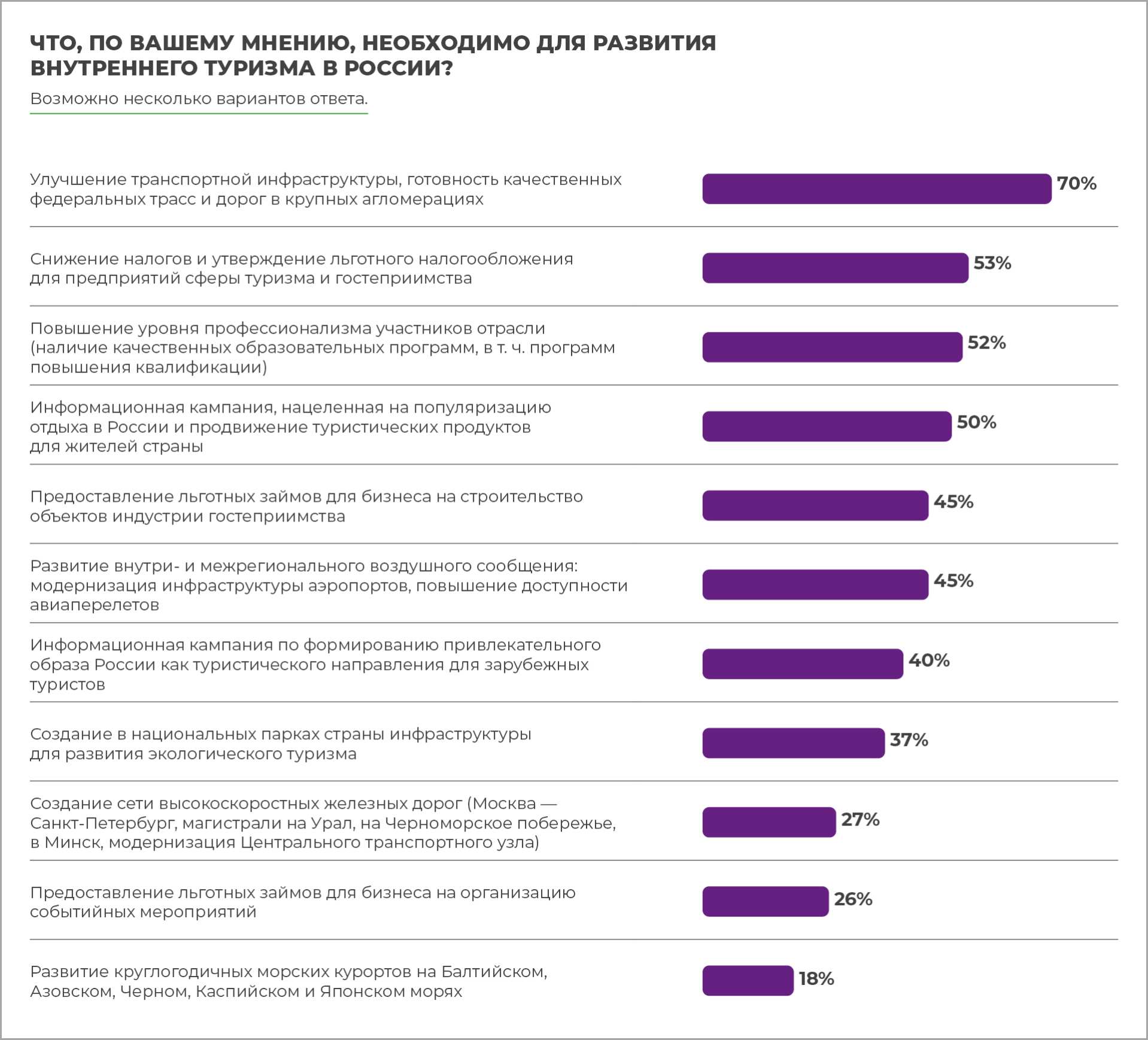 предпринимателей, опрошенных нами, считают, что для развития внутреннего туризма в России, прежде всего, необходимо улучшить транспортную инфраструктуру, 53% высказались за снижение налогов, а 52% — за повышение уровня профессионализма участников отрасли