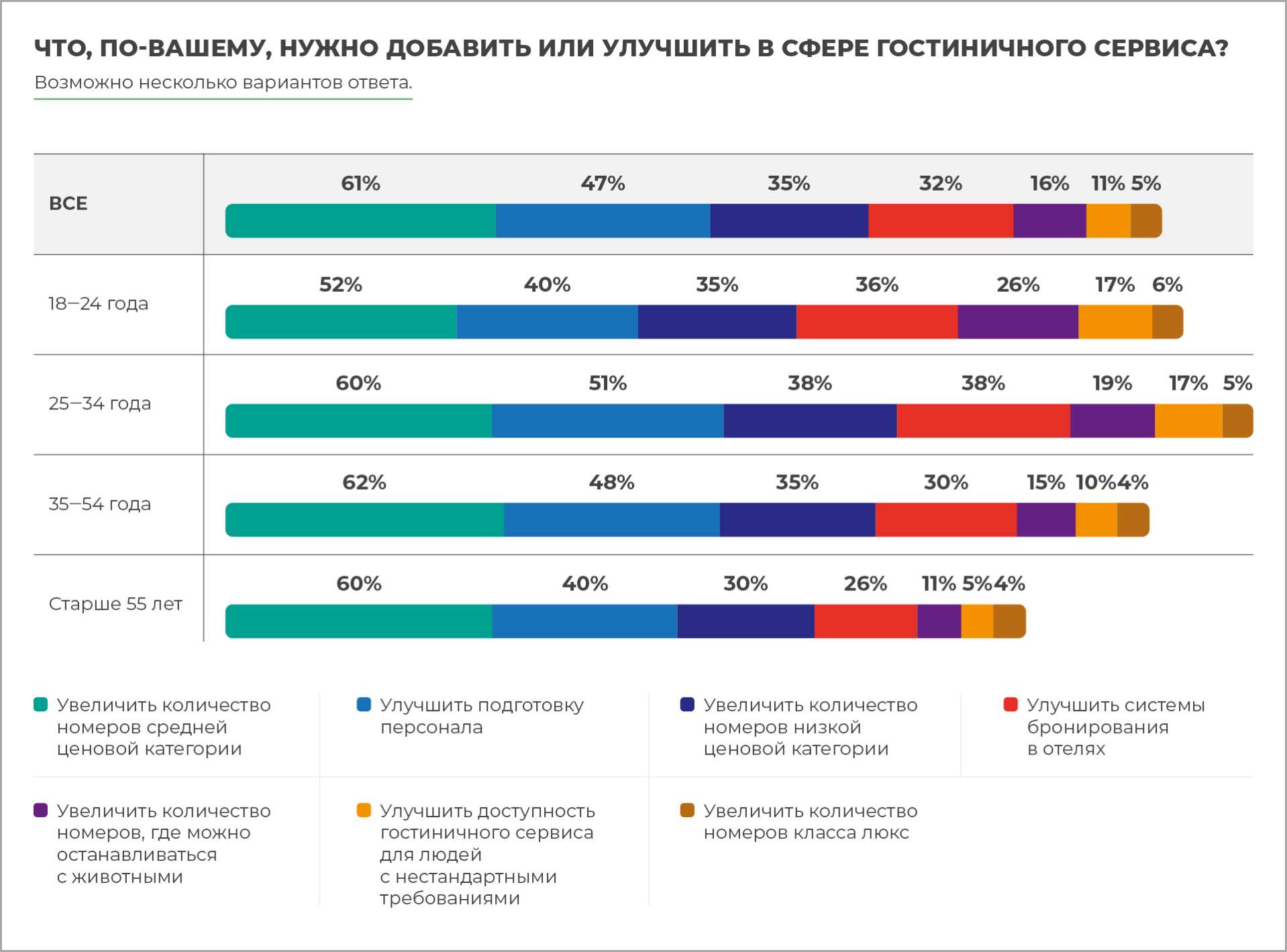 При этом наиболее важной сферой для развития гостиничного сервиса участники опроса считают увеличение количества номеров средней и низкой ценовой категории (61% и 35% соответственно), а также улучшение подготовки персонала (47%). 32% считают необходимым совершенствование системы бронирования в отелях. Стоимость размещения и проезда также имеет решающее значение для большинства опрошенных нами туристов из России.