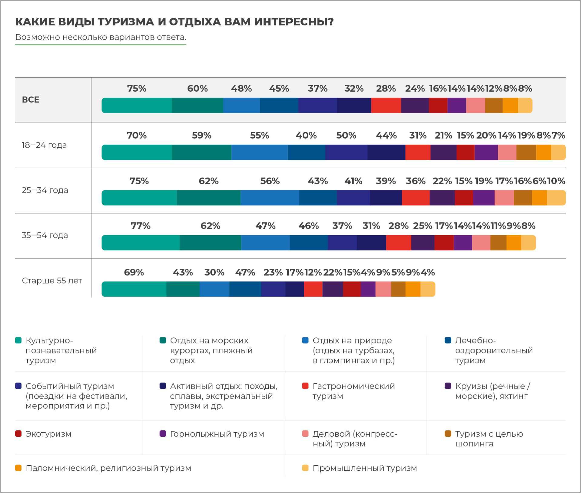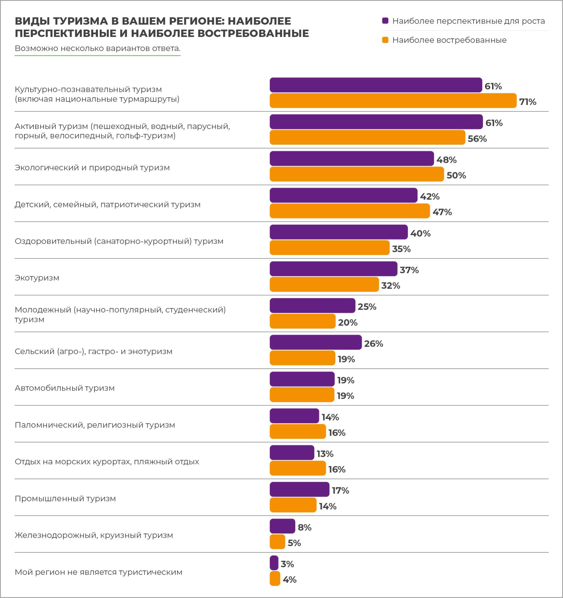Представители туристического бизнеса, опрошенные нами, среди наиболее востребованных видов туризма в своем регионе назвали следующие: культурно-познавательный туризм — 71%, активный туризм — 56% (перспективы роста — 61%), экологический туризм — 50% (перспективы роста — 48%). Эти значения немного меняются от региона к региону, что свидетельствует о разнообразии возможностей, которые существуют для развития туристического бизнеса в нашей стране.
