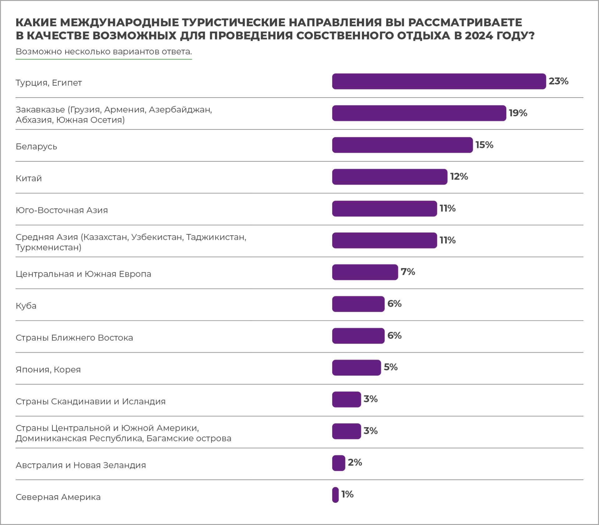Наиболее популярными международными туристическими направлениями, по мнению большей части опрошенных, являются Турция и Египет. В качестве мест отдыха их рассматривают 23% респондентов, республики Закавказья интересуют 19%, Республика Беларусь — еще 15%.