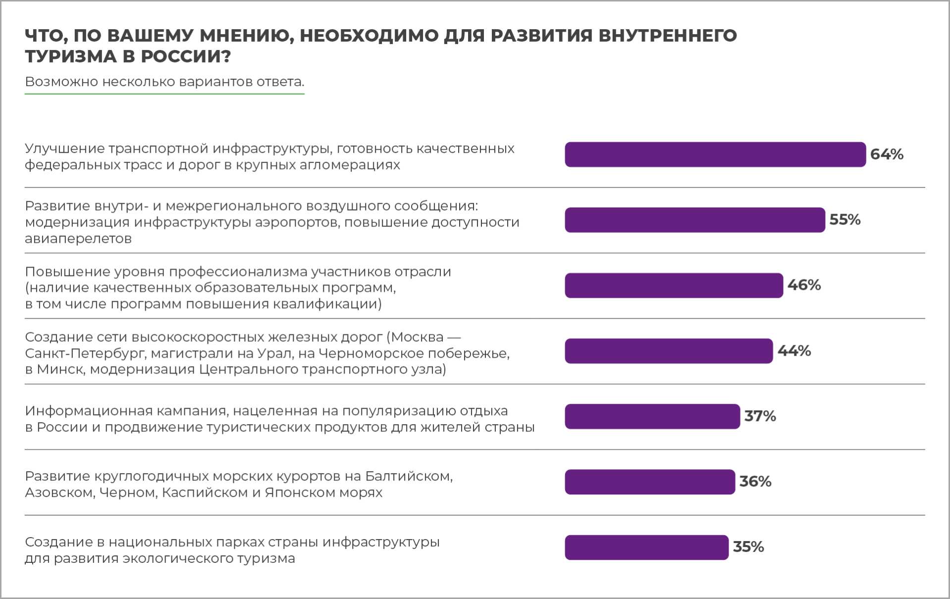 Для дальнейшего развития внутреннего туризма в целом респонденты предложили следующие меры: 64% указали на необходимость улучшения транспортной инфраструктуры, 55% — на развитие внутри- и межрегионального авиасообщения, 46% — на повышение уровня профессионализма участников отрасли.