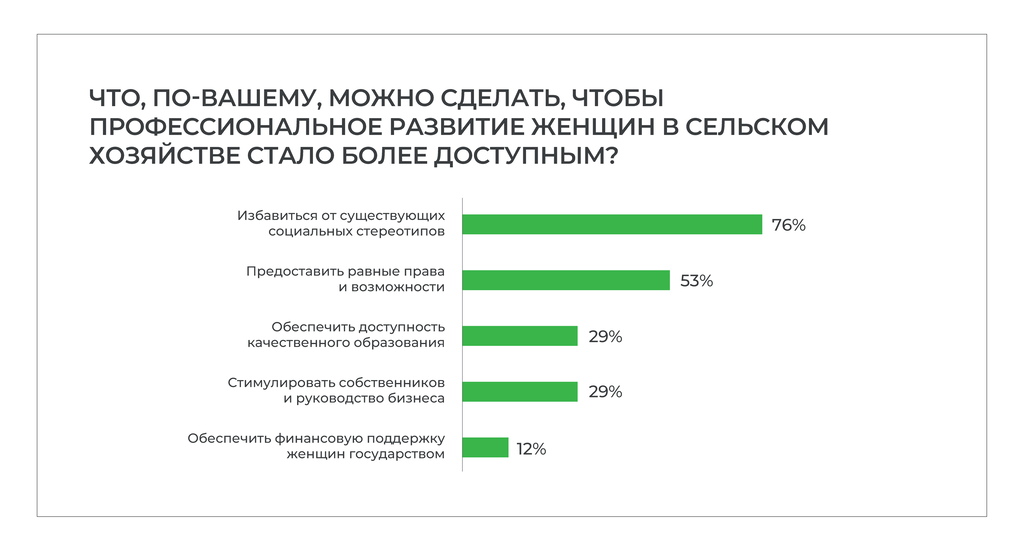 76% опрошенных назвали избавление от существующих стереотипов главной предпосылкой, благодаря которой профессиональное развитие женщин в агробизнесе станет более доступным. Важность предоставления равных прав и возможностей подчеркнули 53% респондентов