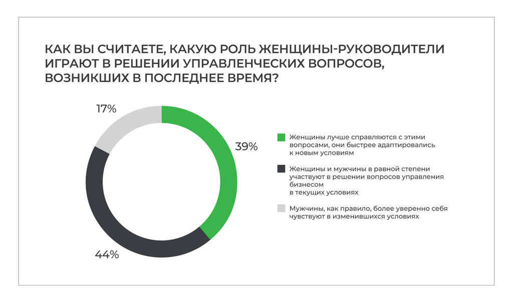 Как показали результаты исследования, женщины, занимающие руководящие должности, считают важным для успеха в отрасли (помимо желания заниматься этим видом бизнеса) поддержку близких