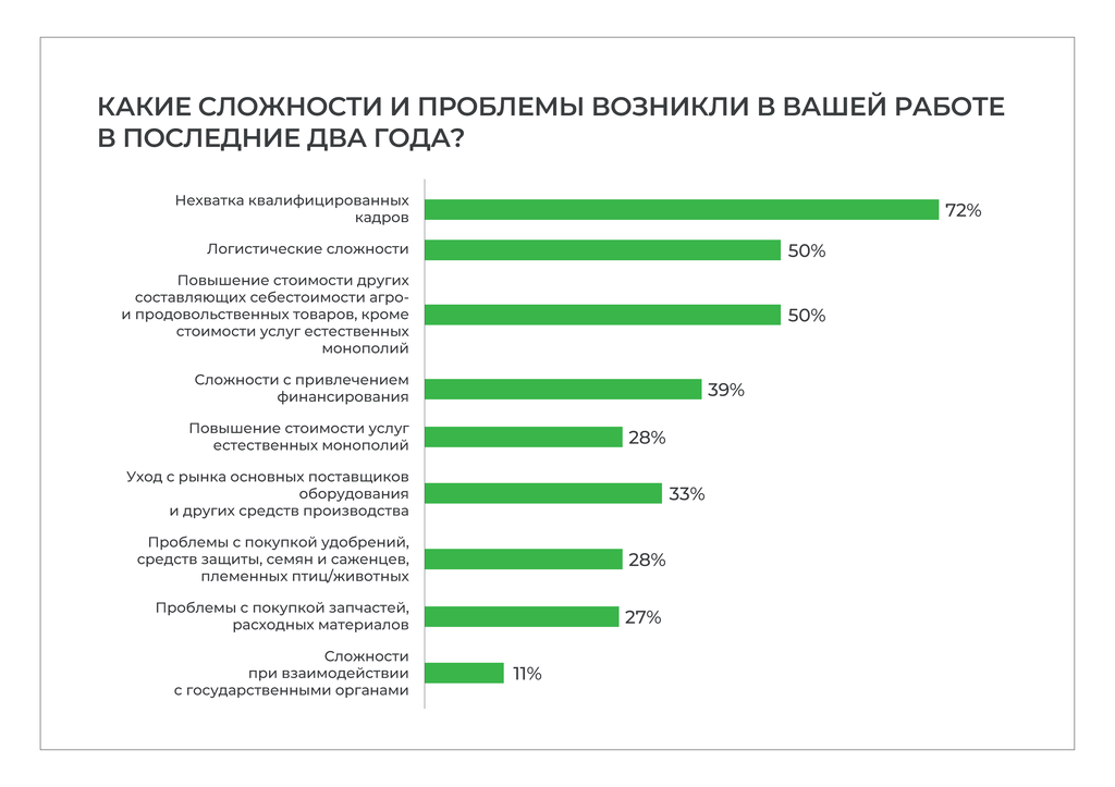 Наибольшую озабоченность у участников исследования вызывают вопросы, связанные с кадрами: многие ощущают нехватку квалифицированного персонала в отрасли. На позиции, требующие серьезной подготовки, найти специалистов очень трудно. Как правило, подходящие сотрудники – это люди предпенсионного возраста. Молодые кадры, даже прошедшие обучение по специальностям, связанным с АПК, не спешат трудоустраиваться в сфере сельского хозяйства. Девушек среди них единицы, и они редко попадают на работу в производственные подразделения.