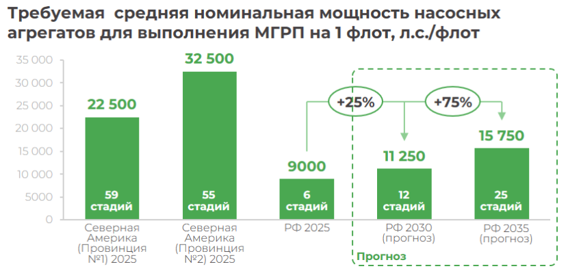 - К 2035 году необходимо увеличить среднюю номинальную мощность насосных агрегатов для выполнения МГРП на 75% (с 9000 до 15 750) с учетом увеличения количества стадий на скважину до 25 скважино-операций