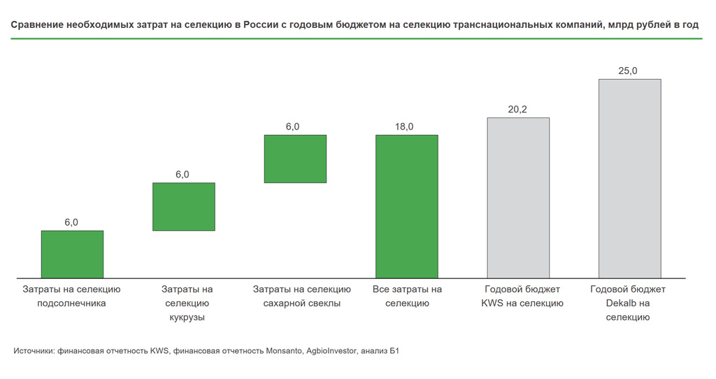 Для выведения одного сорта необходимы инвестиции в объеме 2 млрд рублей, при этом срок разработки составляет 10 лет. Годовой объем инвестиций на создание одного сорта составляет ~200 млн рублей. России из-за географических особенностей необходимо иметь 30 сортов каждой культуры, и суммарный объем инвестиций на разработку отечественных сортов по наиболее зависимым культурам составит 18 млрд рублей в год.