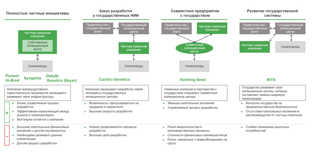 Сорта, разработанные транснациональными компаниями, могут выращивать во многих странах, что открывает им доступ к значительной части рынка и позволяет бизнесу быть более коммерчески успешным. Ввиду ограниченности рынка РФ российские разработки будут дольше окупаться.