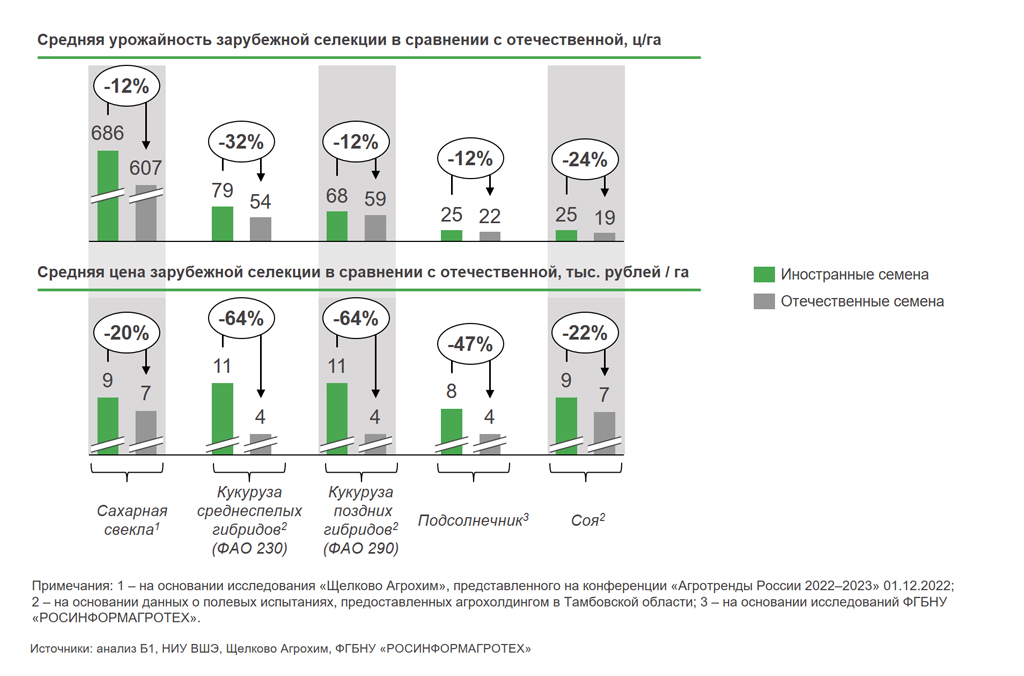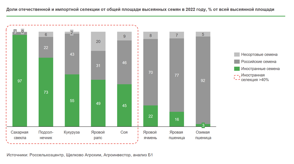 В 2022 году на отечественную селекцию по большинству культур приходилось менее 50% сортов и гибридов. Несортовыми семенами считаются семена, пересеянные многократно без контроля качества и сертификации со стороны Россельхознадзора, а также контрафактные семена.