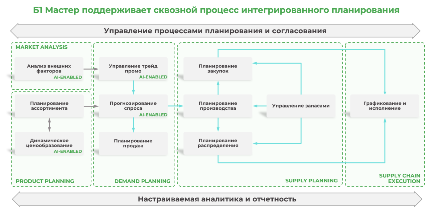 Мария Ермолина, ведущий архитектор Б1 и методолог в области процессов IBP, представила карту бизнес-процессов, которые охватывает «Б1 Мастер». Это полноценный сквозной цикл интегрированного бизнес-планирования: от анализа внешних факторов и прогнозирования спроса с учетом жизненного цикла товара до планирования производства, закупок, управления запасами и детального графикования.