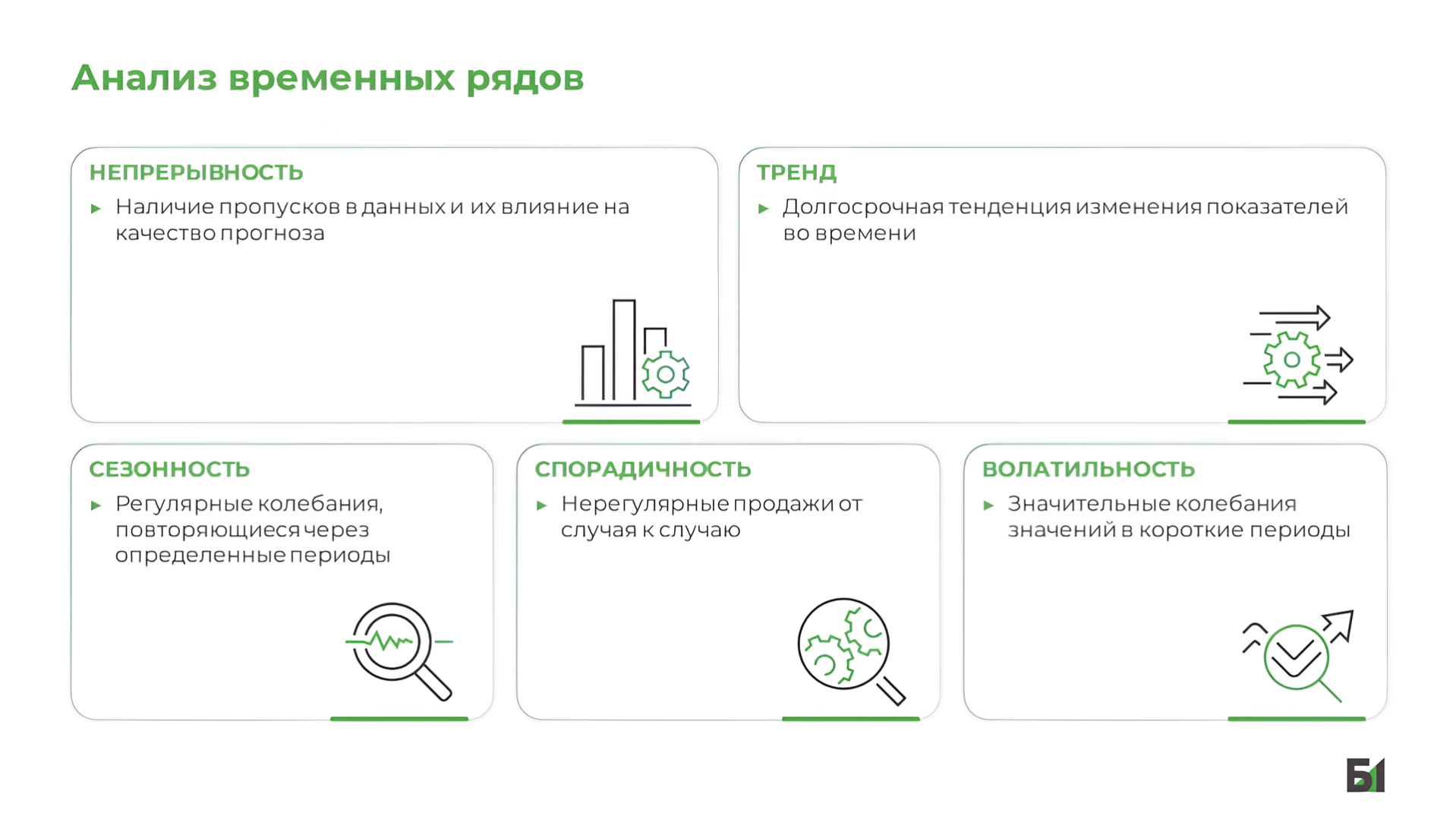 После сегментации для каждого сегмента, в особенности для приоритетных A и B, проводился анализ временных рядов для выявления ключевых характеристик: непрерывность, тренд, сезонность, спорадичность и волатильность. На основе этого анализа данные распределялись по кластерам, и для каждого кластера применялась своя модель прогнозирования. Для структурированного спроса с трендом и сезонностью эффективно работала модель Холта-Винтерса, а для спорадического спроса использовались специализированные методы, такие как Кростон. Интересно, что среднее арифметическое также оставалось востребованным для бизнеса в определенных случаях ввиду его предсказуемости и понятности. Помимо базовых методов прогнозирования, использовались и методы машинного обучения, такие как Prophet и Catboost.