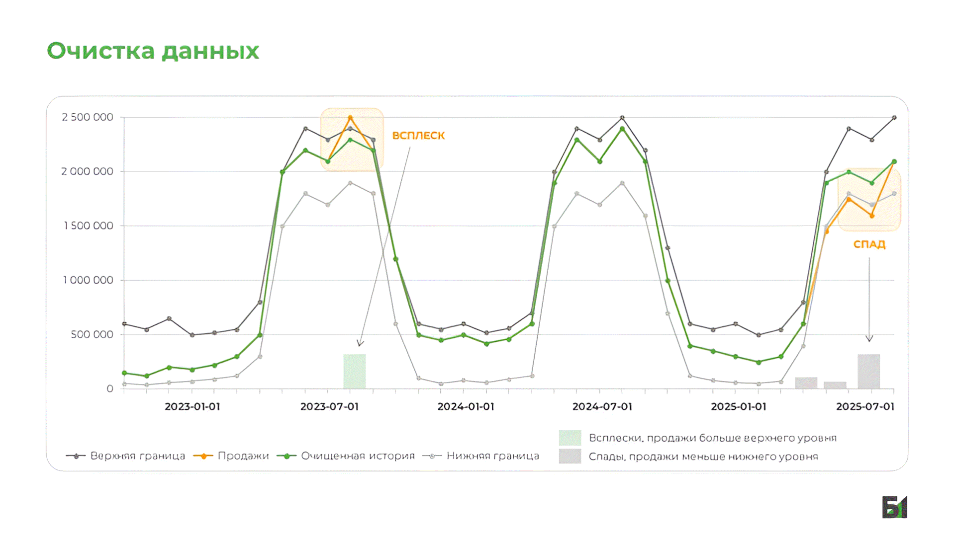 После этого происходит очистка данных и выявление аномалий. В рамках проекта на текущем этапе это происходит через построение доверительного «коридора» на основе сглаженного временного ряда. Это позволяет не только подготовить данные к последующему прогнозированию, но и открывает возможность для анализа эффектов от предпринятых ранее событий.