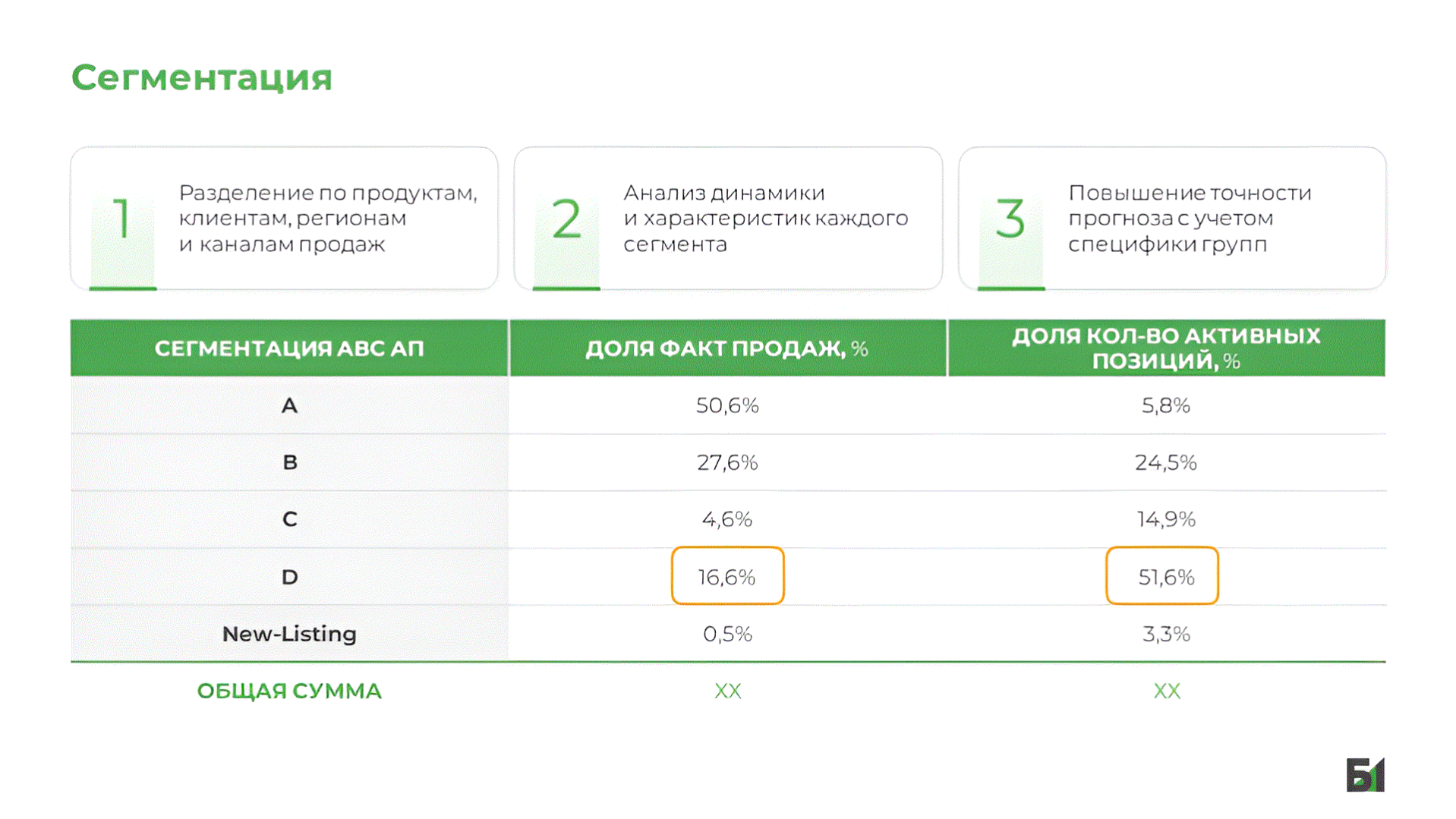 - Сегмент D (Неактивные/ «Уходящая натура») — позиции, не продававшиеся последние 4-6 месяцев. В классической модели этот сегмент должен занимать около 5% объема, но в реальности проекта он составил порядка 16% объема и целых 50% всех комбинаций