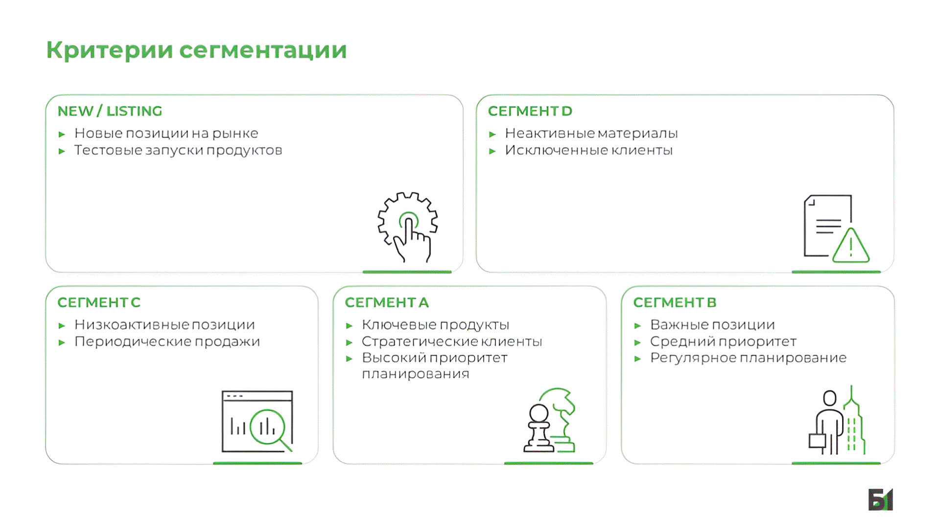 По ходу проекта выявился побочный эффект: в сегмент D стали попадать не только неактивные материалы и исключенные клиенты, но и позиции с ошибками в справочниках. Например, при выводе продукта из матрицы не был указан его наследник. Или ошибки в справочниках приводили к появлению «фантомных» объектов планирования с единичными, хаотичными продажами.